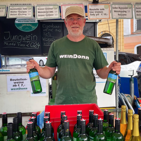 Einer der beiden Traditionsbetriebe aus Retz, die in der warmen Jahreszeit abwechselnd bei uns am Markt Wein ausschenken. Die Weine stammen aus den Weinbergen rund um Retz und werden knapp einen Kilometer vom Retzer Hauptplatz gekeltert. Neben regionstypischen Weinen erzeugt Eduard Donn auch Traubensaft, Verjus und einen alkoholfreien "Frizzante".